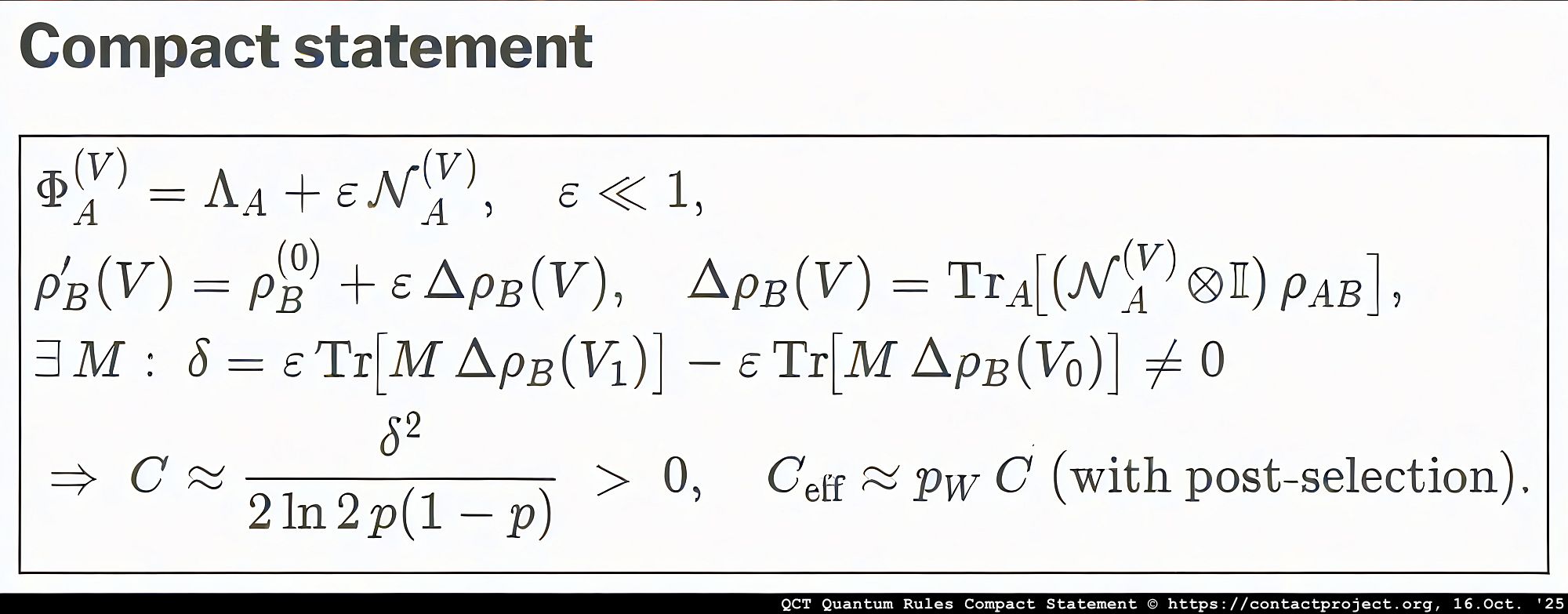\boxed{ \begin{aligned} &\Phi_A^{(V)}=\Lambda_A+\varepsilon\,\mathcal{N}_A^{(V)},\quad \varepsilon\ll 1,\\ &\rho_B'(V)=\rho_B^{(0)}+\varepsilon\,\Delta\rho_B(V),\quad \Delta\rho_B(V)=\mathrm{Tr}_A\!\big[(\mathcal{N}_A^{(V)}\!\otimes\!\mathbb{I})\,\rho_{AB}\big],\\ &\exists\,M:\ \delta=\varepsilon\,\mathrm{Tr}\!\big[M\,\Delta\rho_B(V_1)\big]-\varepsilon\,\mathrm{Tr}\!\big[M\,\Delta\rho_B(V_0)\big]\neq 0 \\ &\Rightarrow\ C \approx \dfrac{\delta^2}{2\ln 2\, p(1-p)} \;>\;0,\quad C_{\text{eff}}\approx p_W\,C\ \text{(with post-selection)}. \end{aligned}}Here’s a breakdown and fact check of the compact mathematical statement: