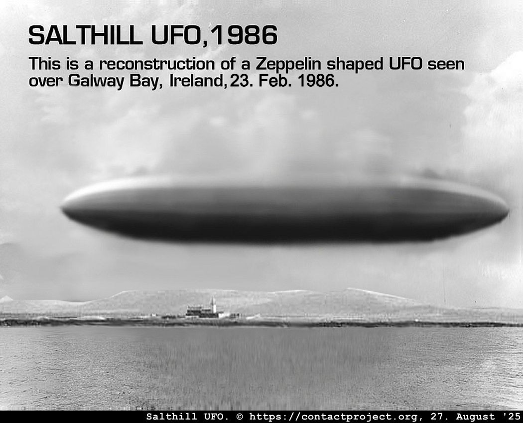 - Description: Large structured UFO came into view from behind houses during uphill walk near Salthill/Claddagh. Hovered silently over Galway Bay, then disappeared after brief re-observation.